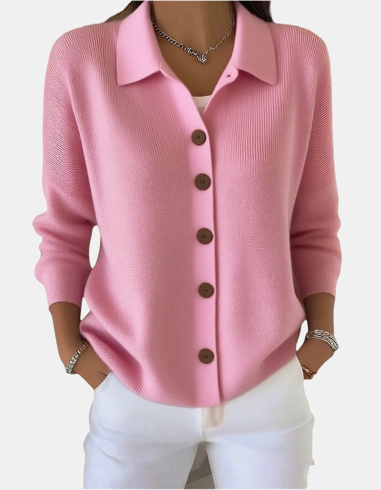 A soft, elegant knit blouse finished with classic button detailing. Designed with a refined collar and relaxed fit, it blends comfort and minimal chic for effortless everyday wear.